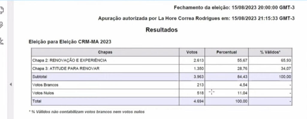 Os médicos do Maranhão elegeram a Chapa 2 – Renovação e Experiência – para comandar o Conselho Regional de Medicina pelos próximos cinco anos, 2023 a 2028. O presidente em exercício Dr José Albuquerque foi eleito com 65,93% dos votos válidos, ele venceu Édson Araújo Júnior da Chapa 3 que teve 34,07%. A Chapa 1, […]