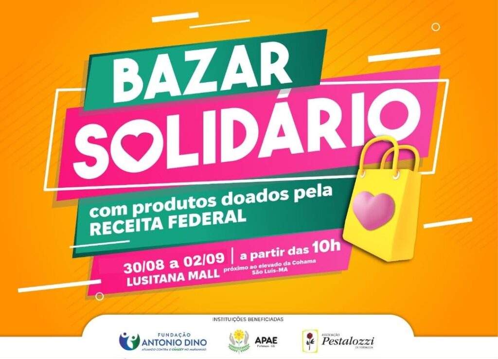 O Bazar Solidário com produtos doados pela RECEITA FEDERAL inicia nesta quarta-feira, dia 30 de agosto e funcionará até sábado (02) setembro das 10 às 20 hs, no Lusitana Mall- Cohama em São Luís MA. Desta vez o bazar beneficiará três Instituições filantrópicas: Associação Pestalozzi de Fortaleza; APAE de Fortaleza e Fundação Antonio Dino em […]