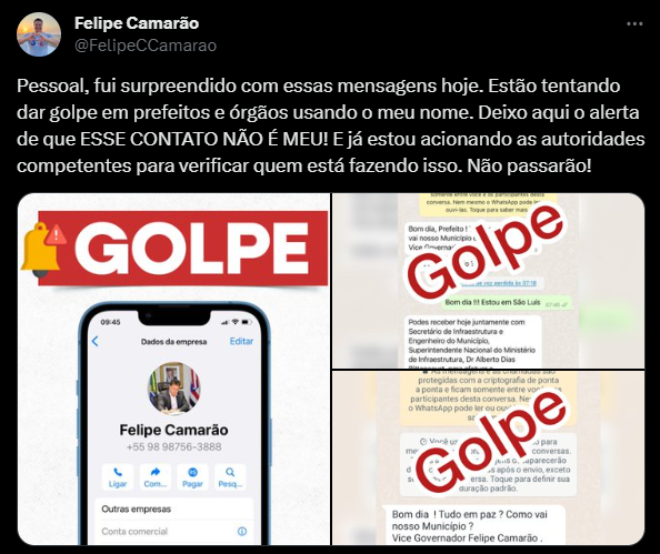 O vice-governador e secretário de Estado de Educação, Felipe Camarão (PT), usou suas redes sociais na manhã desta quarta-feira (18), para informa que bandidos estão usando um número de telefone no WhatsApp para aplicar golpes usando seu nome e sua imagem. A ousadia dos bandidos chamou atenção para os cuidados que devem ser tomados […]