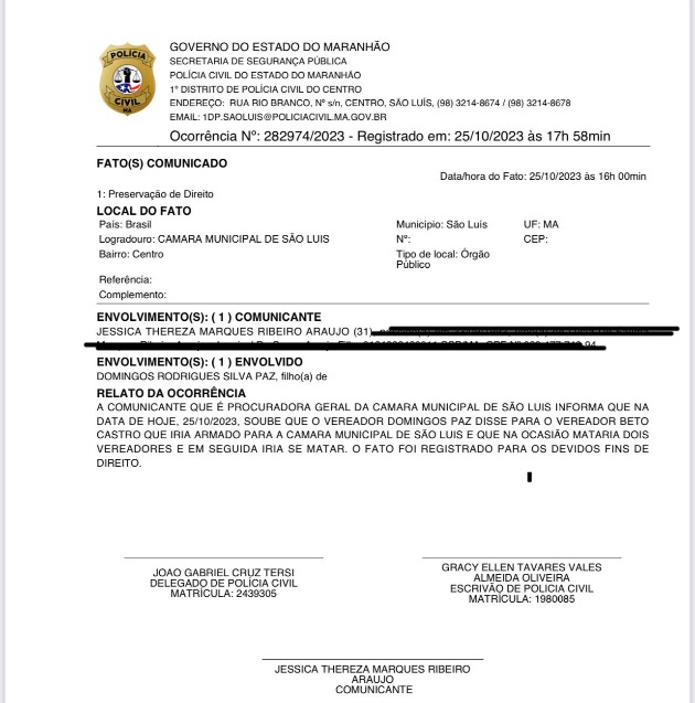 O Blog do Domingos Costa divulgou um Boletim de Ocorrência nº 282974/2023 registrado nesta quarta-feira (25) no 1º Distrito de Polícia Civil do Centro de São Luís, pela Procuradora Geral da Câmara, Jessica Thereza Marques Ribeiro Araújo, no qual ela narra uma história perturbadora. A procurada conta que tomou conhecimento que o vereador por São […]
