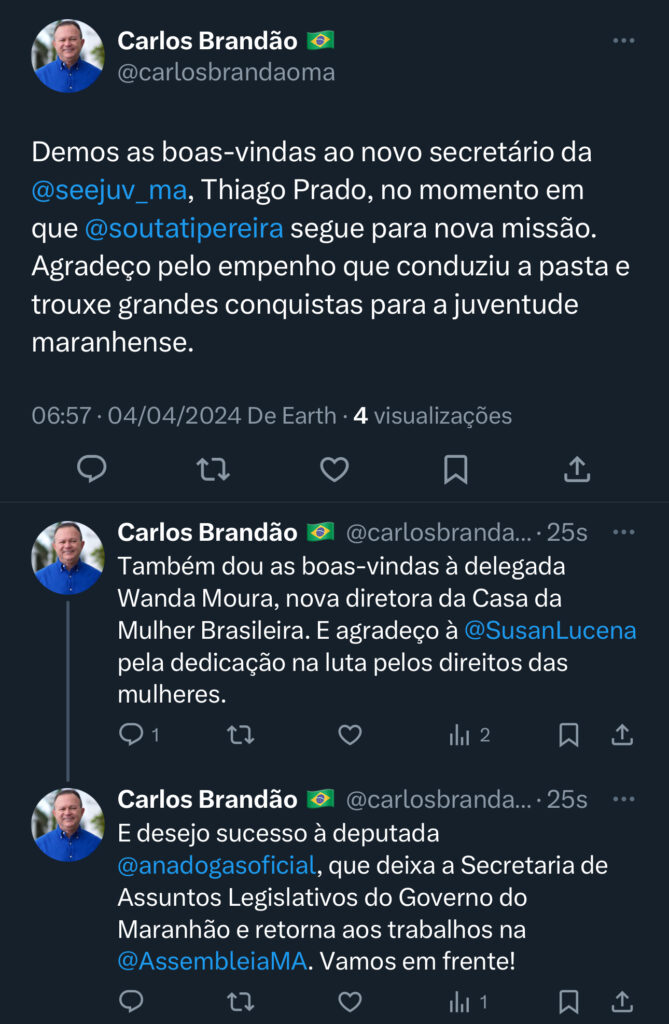 O governador Carlos Brandão (PSB), divulgou na manhã desta quinta-feira, 4 de abril, mudanças em seu governo. Thiago Prado é o novo titular da Secretaria da Juventude e Wanda Moura assume a Casa da Mulher Brasileira. Thiago assume o lugar de Tatiana Pereira que estava no cargo desde 2015 na gestão de Flávio Dino e […]
