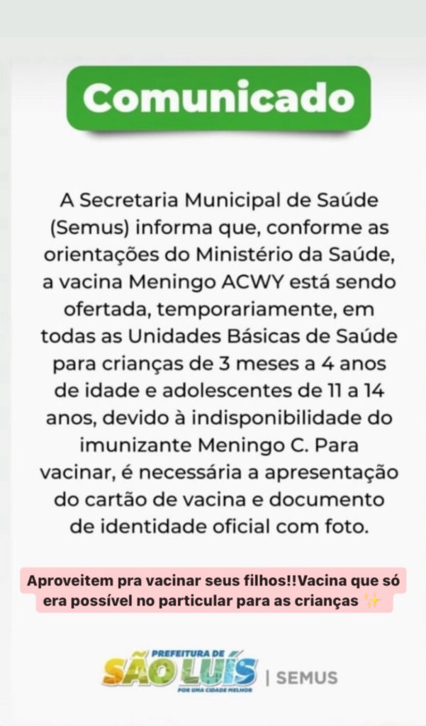 Vacina que combate meningite que custa R$420, está sendo aplicada de graça na rede pública de São Luís